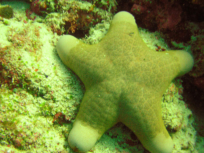 These Schmedelian pincushion sea stars, Culcita schmedeliana, were moderately common.